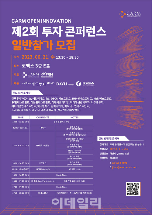 이번 CARM 오픈이노베이션 투자 콘퍼런스는 행사 윤건수 한국벤처캐피탈협회 회장의 기조강연으로 시작한다. 14개 재생의료 기업의 IR 발표와 국내 약 55개 투자사의 질의와 상담 자문으로 진행된다. 다수의 전략적 투자자들이 하반기 제약바이오 분야 투자 동향을 파악하고 사업 협력을 모색하기 위해 참여할 예정이다.이번 IR 발표 및 일대일 상담에 참여하는 16개 기업은 △뉴롤메드 △마루테라퓨틱스 △마크헬츠 △비엘리먼트 △스템엑소원 △아크로셀바이오사이언스 △엑셀세라퓨틱스 △유스바이오글로벌 △인스템케어 △일리아스바이오로직스 △진메디신 △클립스비엔씨 △파이안바이오테크놀로지 △펜타메딕스 △프리모리스테라퓨틱스 △하플사이언스이다.