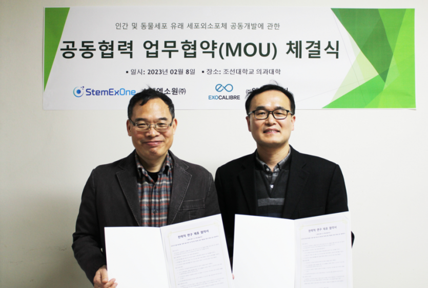 건국대학교 기술지주 자회사 스템엑소원(대표이사 조쌍구)과 조선대학교 기술지주 자회사 엑소캘리버(대표이사 김태형)는 엑소좀 치료제 개발 공동연구를 위한 업무협약(MOU)을 체결했다고 밝혔다.