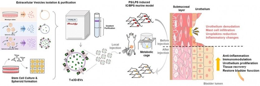 연구팀은 고기능성 중간엽 줄기세포 (MSC) 배양을 위해 고효율 3차원 MSC 회전 타원체 (spheroid) 배양 환경과 함께 유체역학적 전단응력 조절 능력이 뛰어난 신호전달 인자들에 주목했다. 아울러 최적의 고기능성 3차원 줄기세포 회전 타원체 유래 세포외소포체 (또는 엑소좀)인 T-a3D-EV를 생산했고, 근본적인 치료약이 존재하지 않는 난치성 질환인 간질성 방광염 치료에 매우 효과적으로 치료 효능을 나타냄을 밝혔다.